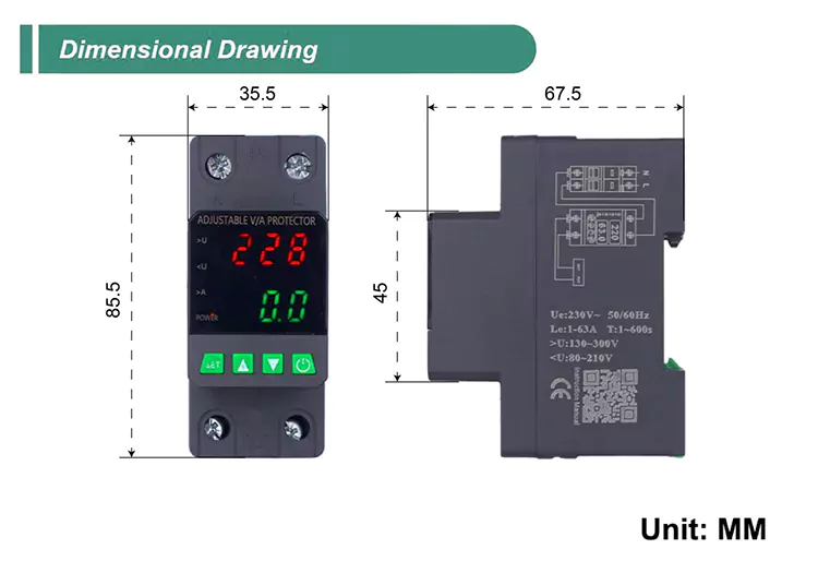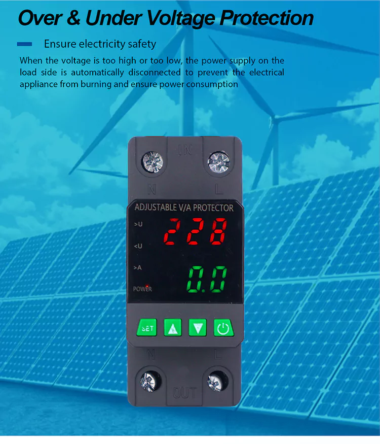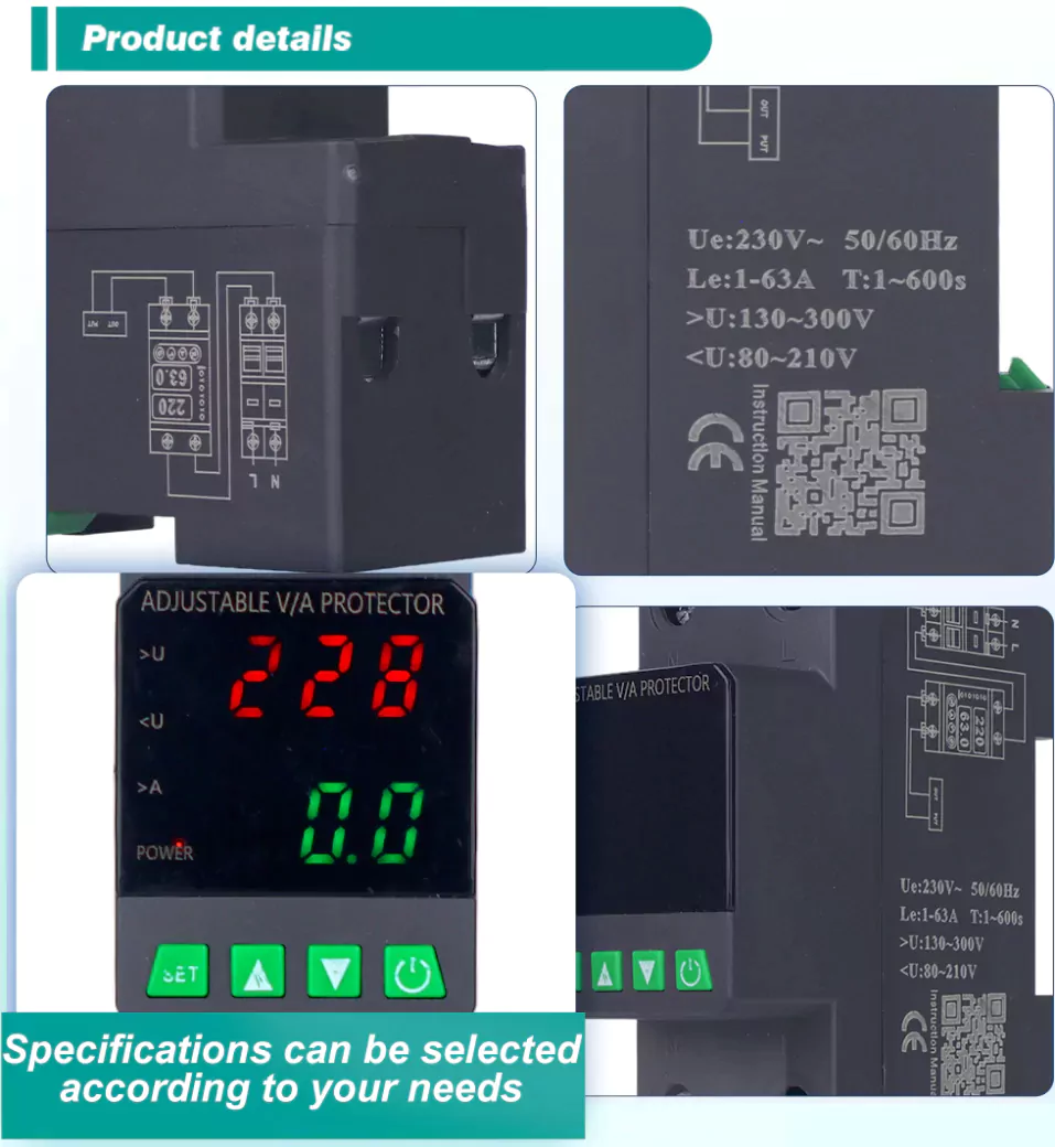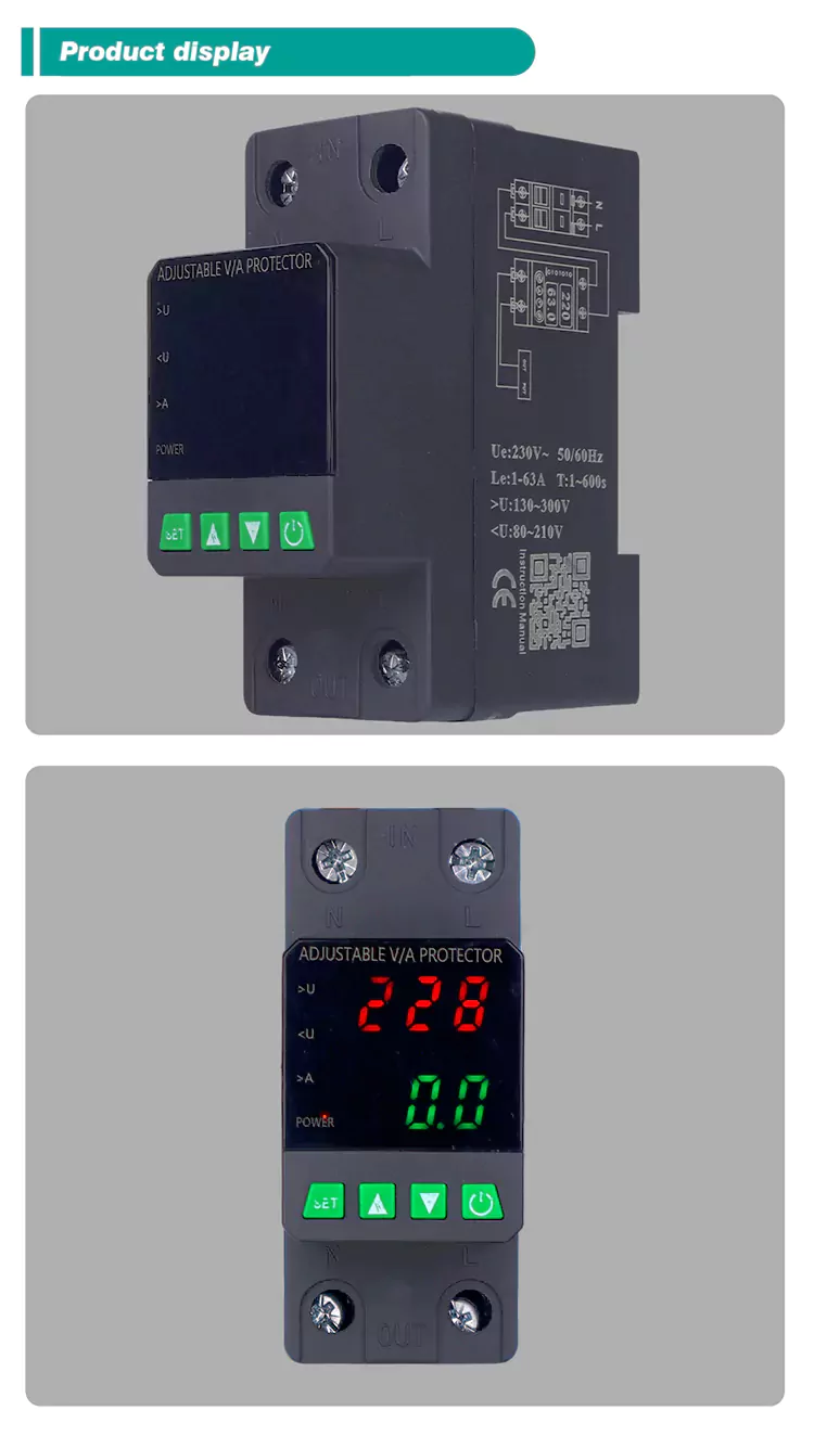 Équipé d'un écran numérique et fabriqué avec des composants électroniques modulaires importés, il a une forte fiabilité et des performances. Le protecteur coupe automatiquement et rapidement l'alimentation pendant les tensions anormales (telles que la surtension, la sous-tension ou les fluctuations de grille) et restaure l'alimentation après que la tension revienne à la normale.