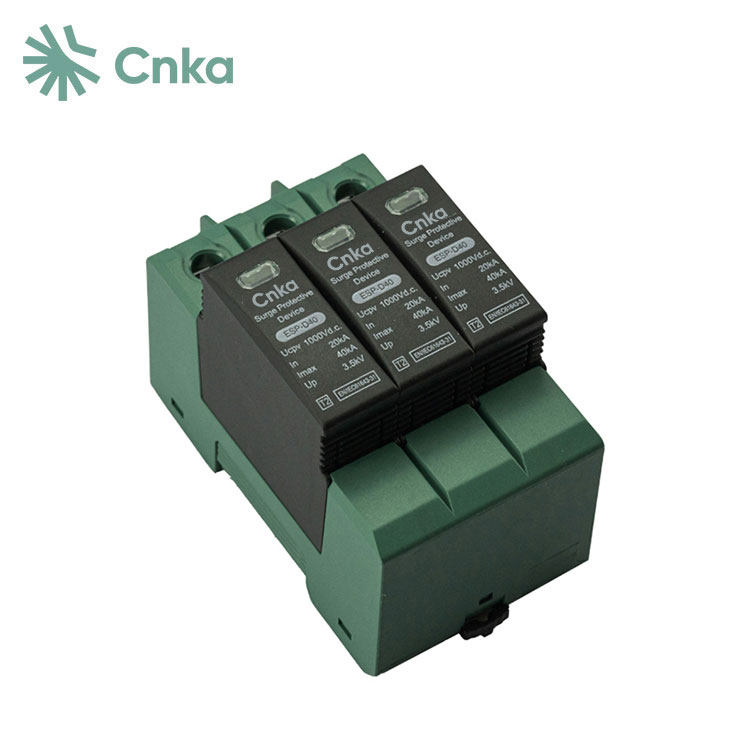 Les fournisseurs chinois CNKA proposent des parafoudres DC abordables fabriqués en Chine. Il est recommandé d'utiliser des parafoudres CC aux deux extrémités de la ligne d'alimentation CC (côté panneau solaire et côté onduleur/convertisseur), en particulier lorsque le câblage de la ligne est externe et long. La série ESP-D40 DC présente une conception de circuit basée sur des MOV à haute énergie, équipés de commutateurs d'isolation thermique spécifiques et d'indicateurs de défaut associés, offrant une protection fiable contre les surtensions. Cette série ESP-D40 comprend également une fonction de signal à distance, permettant aux utilisateurs de surveiller le fonctionnement de l'appareil en temps réel. De plus, la série ESP-D40 DC utilise une conception de module enfichable, permettant une maintenance rapide et pratique en cas de dysfonctionnement.